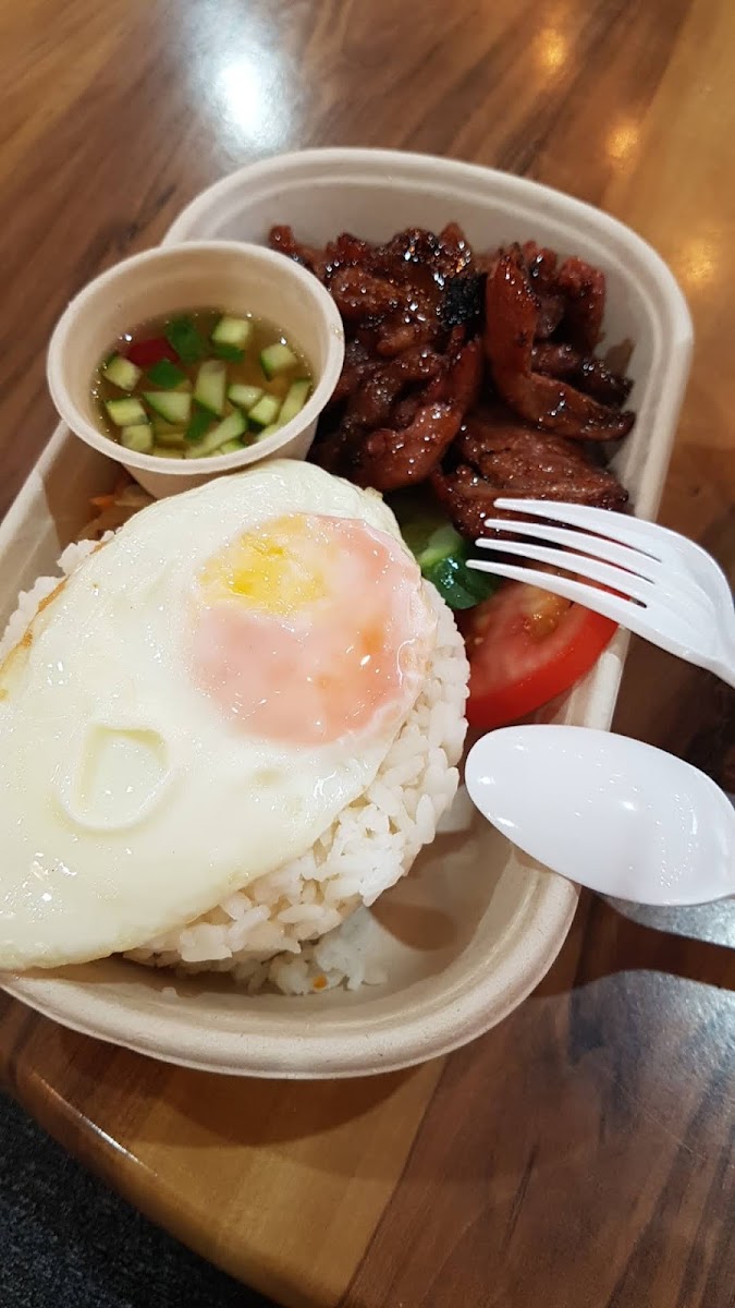 The menu focuses on well-loved Filipino favorites, and the flavors are bold without feeling overwhelming. One dish that immediately stands out is the Tocilog. It’s a classic combination of sweet cured pork, garlic fried rice, and a sunny-side-up egg. The balance works beautifully: savory rice, slightly caramelized pork, and that rich egg yolk tying everything together. It’s the kind of meal that feels satisfying whether you’re grabbing lunch during a busy market visit or sitting down for a relaxed dinner.