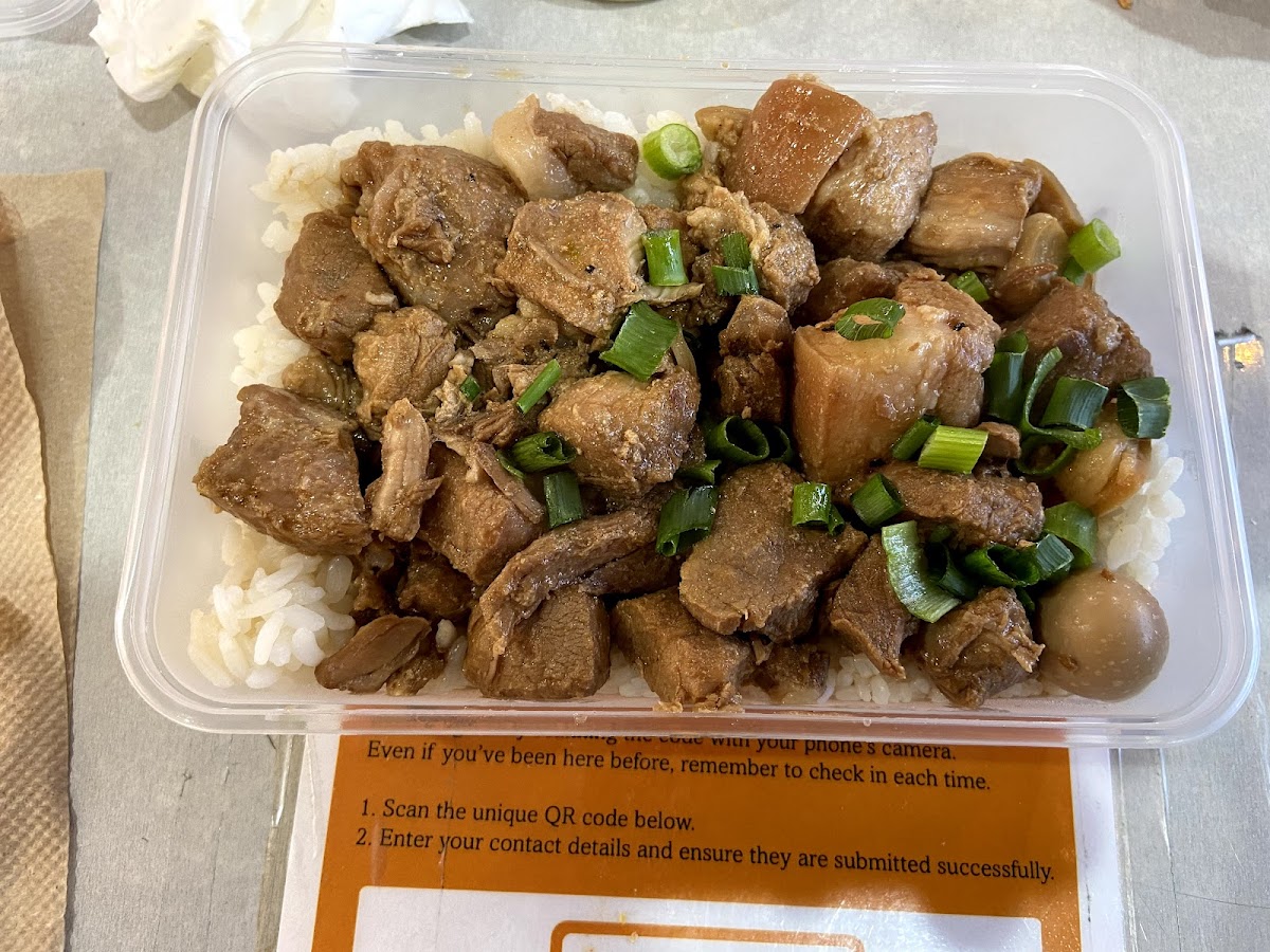 Another staple on the menu is Adobo, one of the most recognizable dishes in Filipino cuisine. Here, the meat is simmered until tender in a savory soy and vinegar blend, creating deep flavor in every bite. The sauce clings perfectly to the rice, and the aroma alone is enough to make nearby diners glance over at your plate.